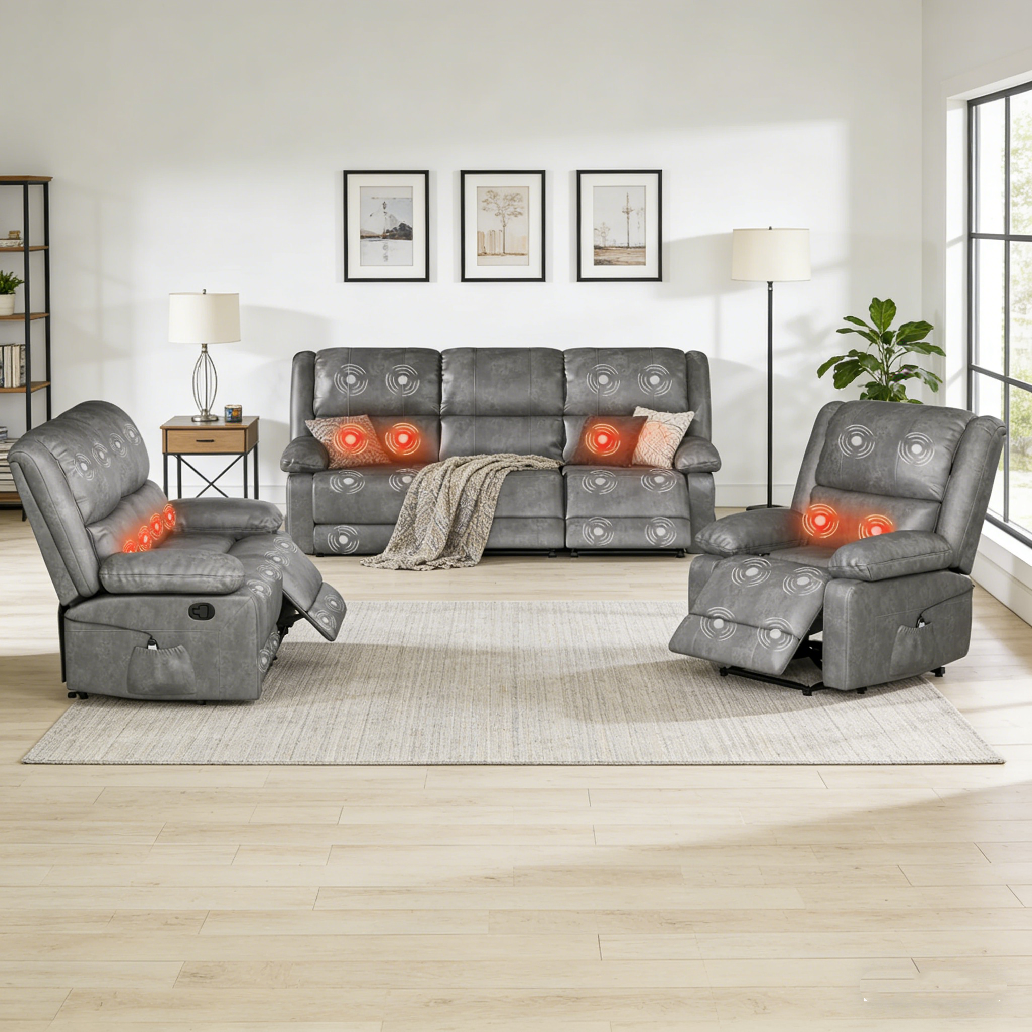 YODOLLA 3‑Piece leather recliner sofa set with massage, heating, adjustable backrests and footrests. Spacious, comfy, and ideal for home theaters...