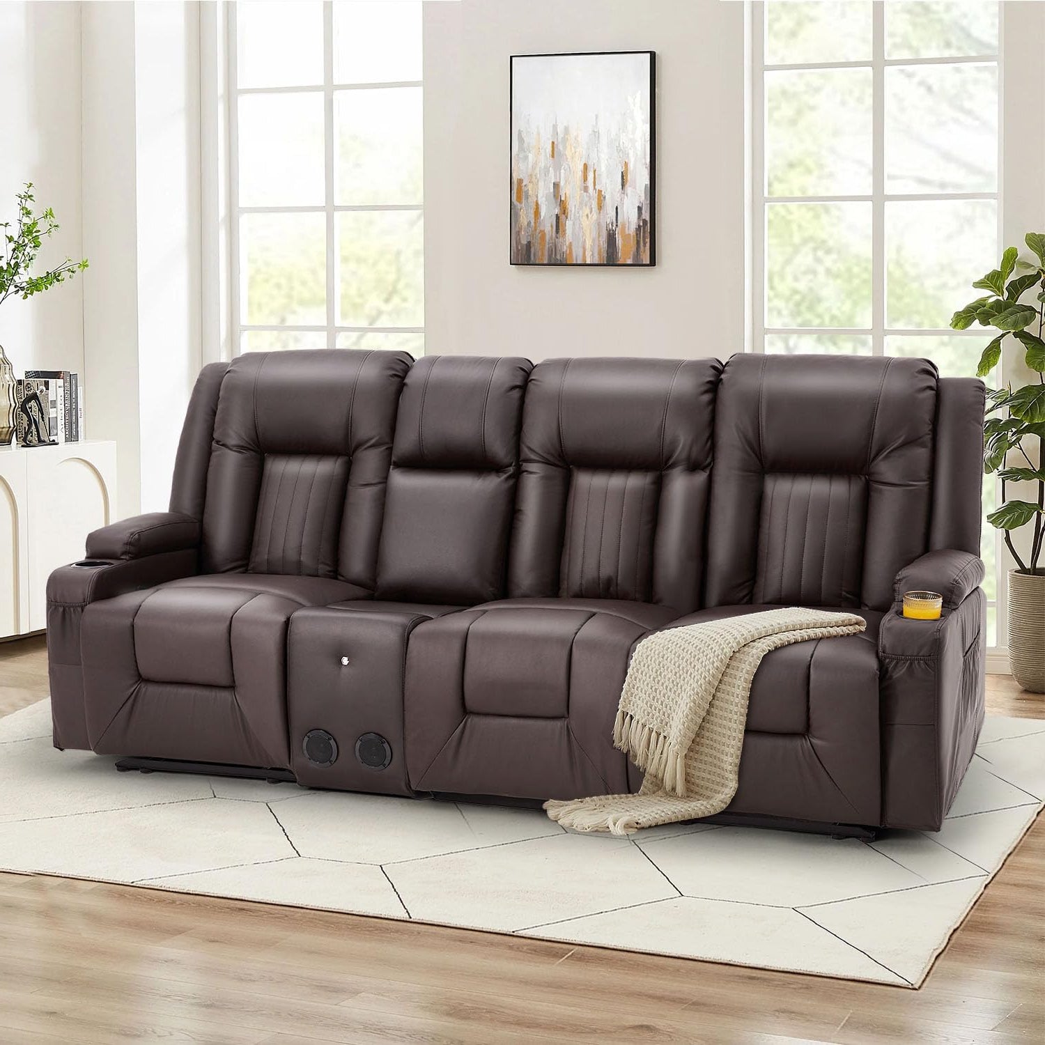 YODOLLA Brown Reclining Sofa w/ 2 Consoles & Speakers