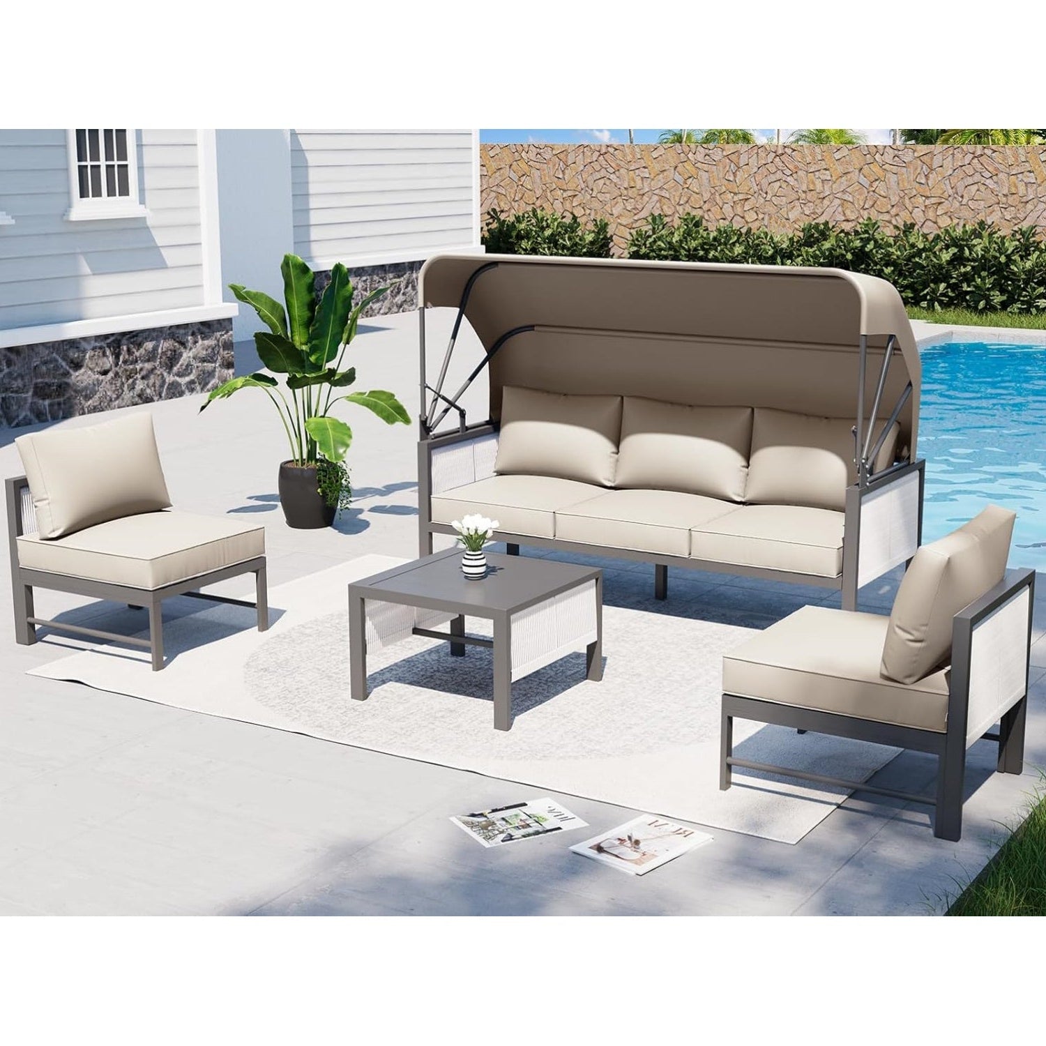 YODOLLA 4 Pieces Aluminum Patio Furniture Set, Retractable Canopy, Beige