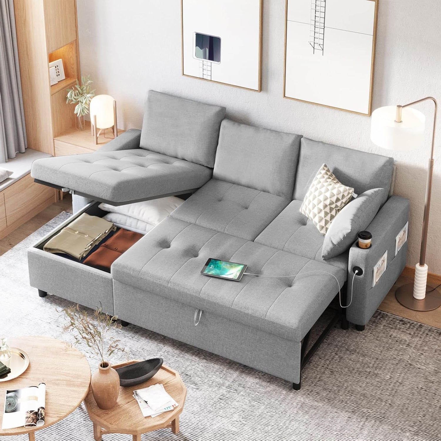 YODOLLA L-Shaped Sleeper Sofa, Pullout Bed, USB & Storage, Grey