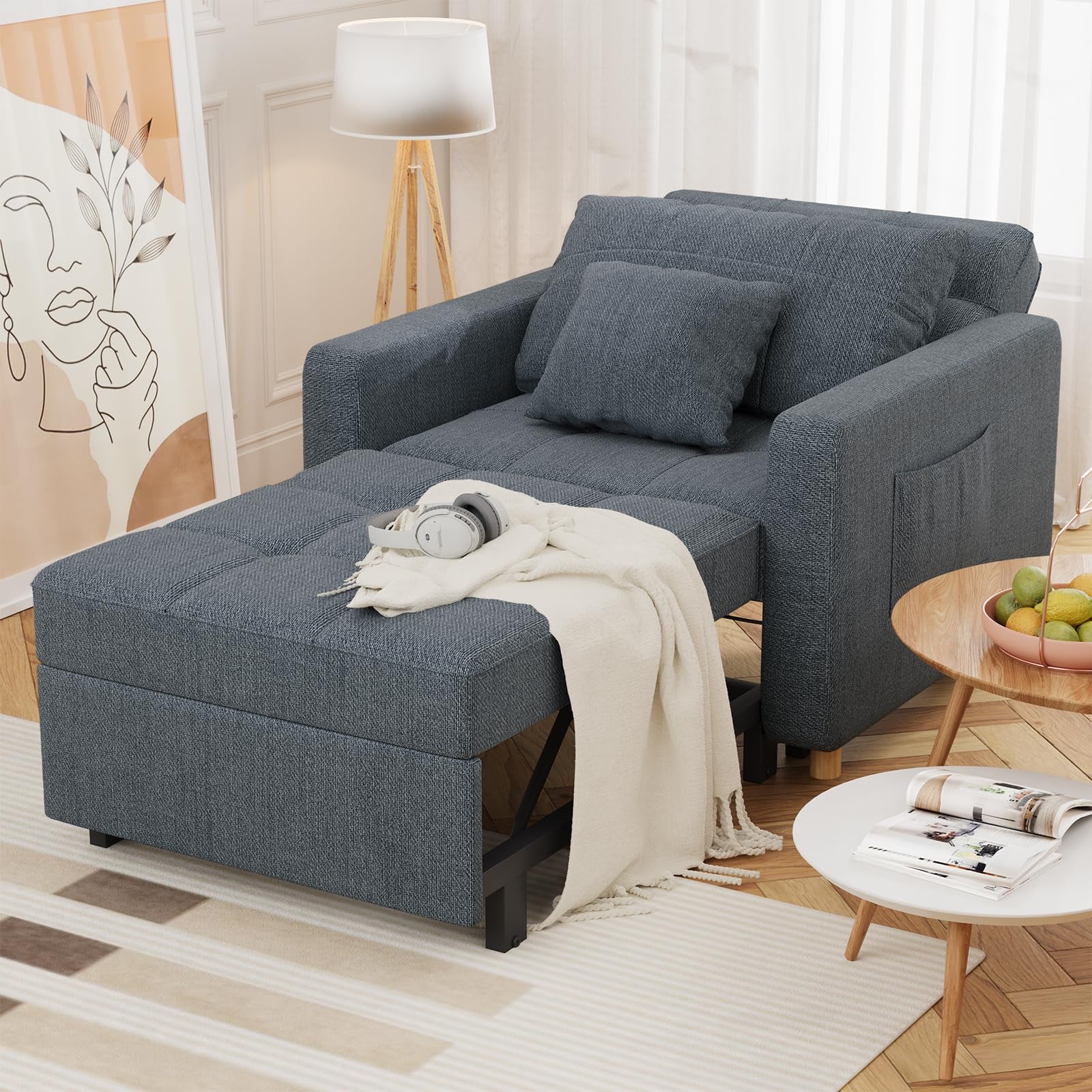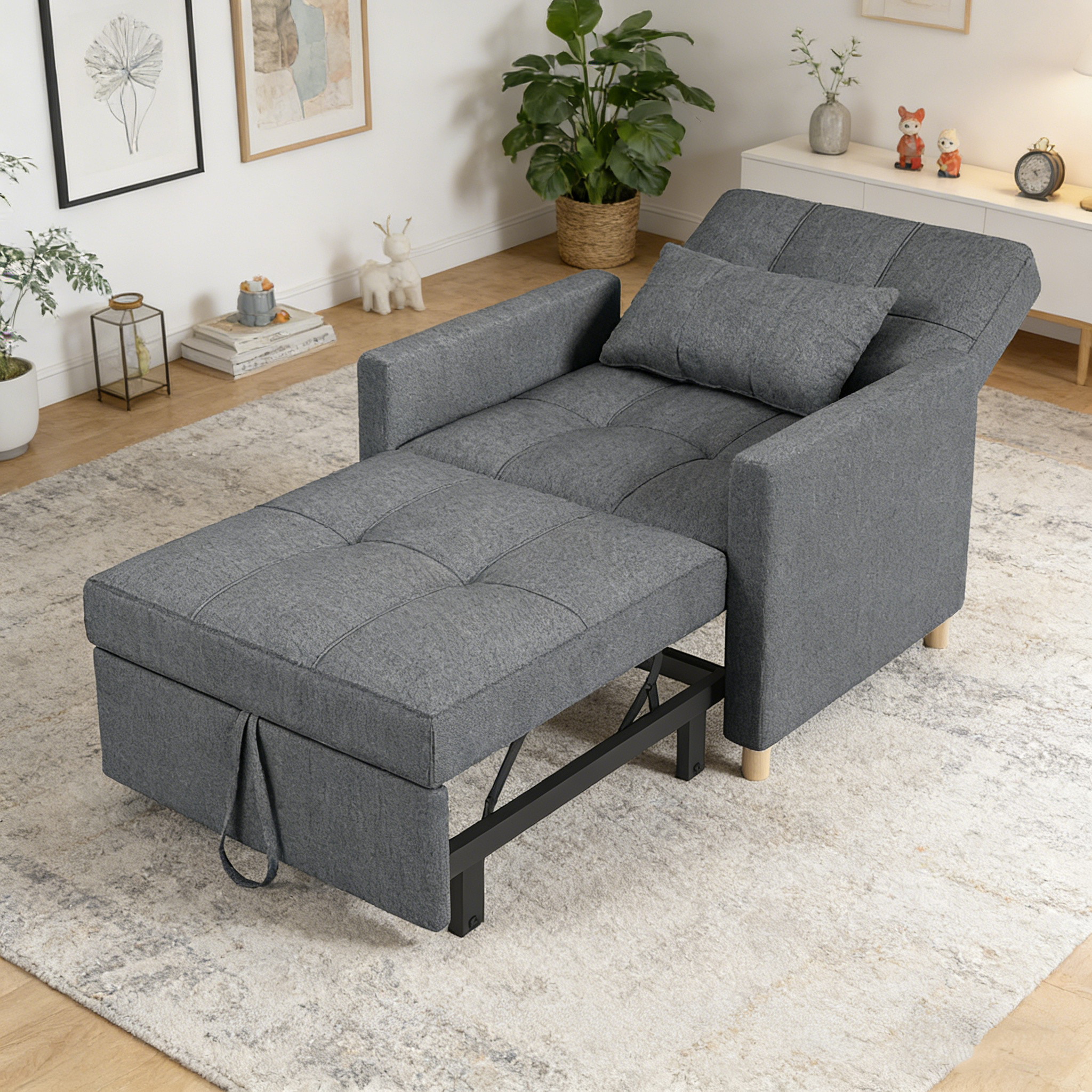 Flexible 3-in-1 design combining armchair, guest bed, and recliner functions. Durable steel frame with breathable linen fabric and multi-angle adjustable backrest for maximum comfort.