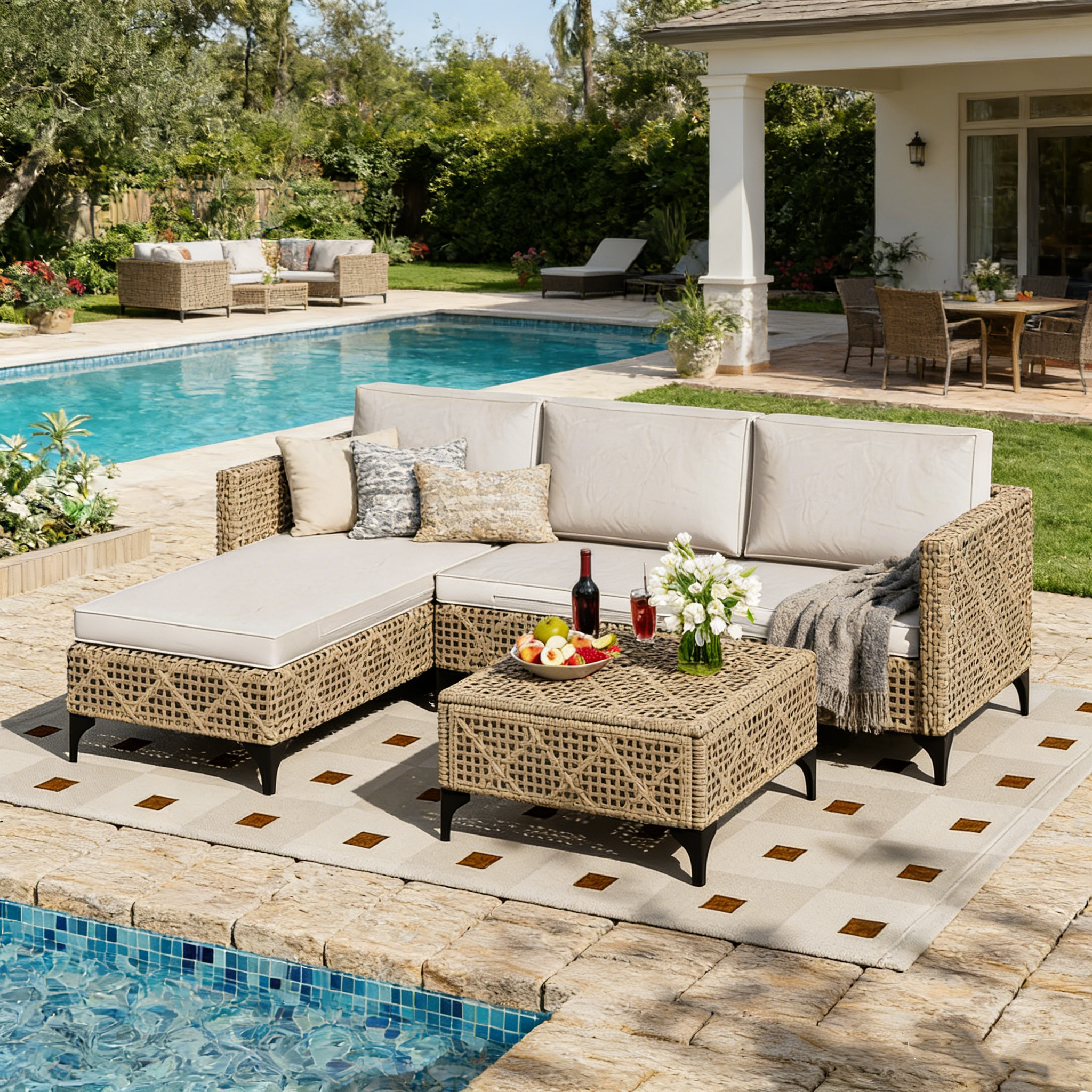 YODOLLA 7-Pc Patio Set, Brown Rattan & Khaki Cushions