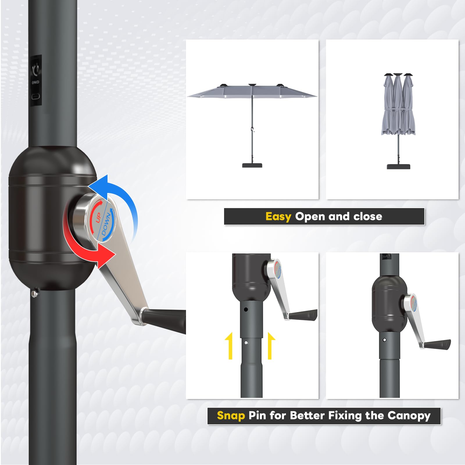 • Effortless Opening & Closing: The crank mechanism enables smooth, resistance-free opening and closing, making assembly and use extremely easy. To extend the umbrella's service life, however, please close and fasten it securely in windy and rainy weather