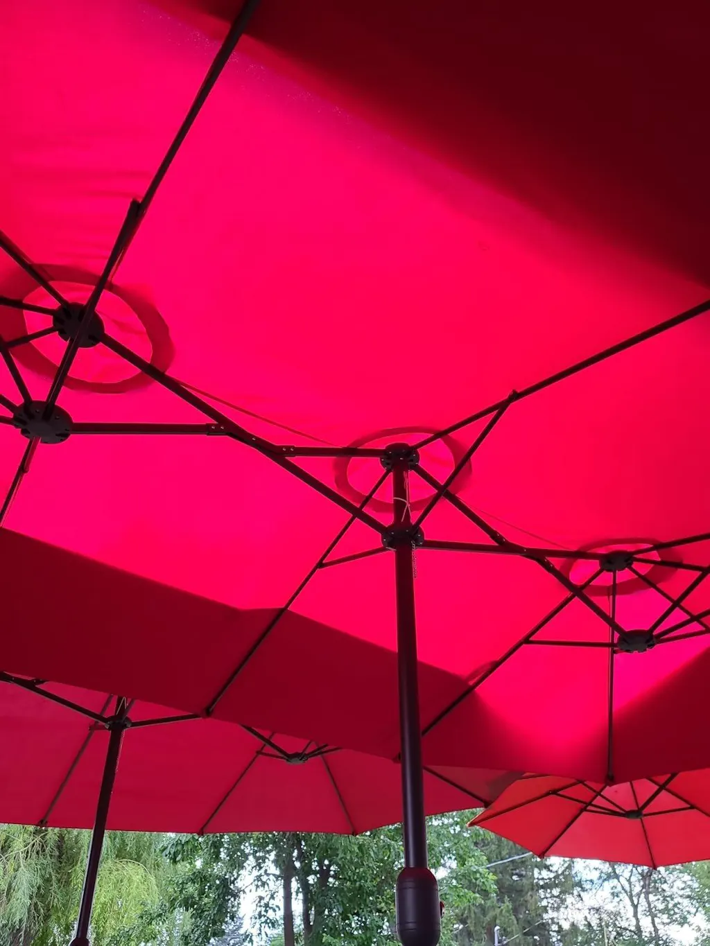 A: The canopy is made from high-quality polyester, making it a waterproof patio umbrella that effectively repels rain. However, for heavy storms, it’s best to close and store the umbrella.