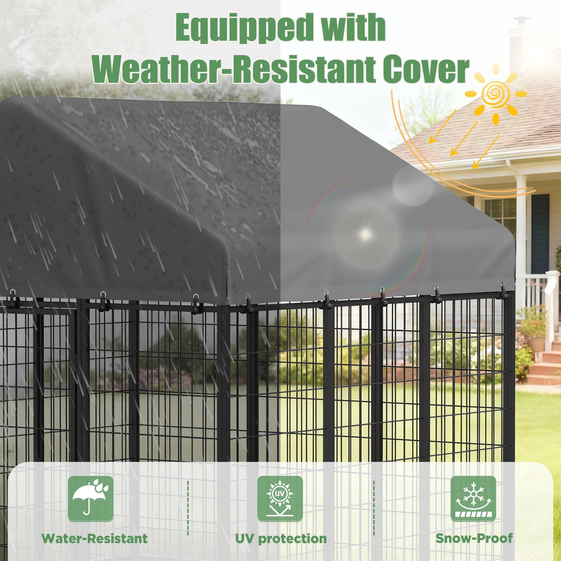 Heavy-duty 6x6 outdoor dog kennel with waterproof cover, secure lock, and spacious run. Durable steel enclosure for safe, weather-resistant pet housing.