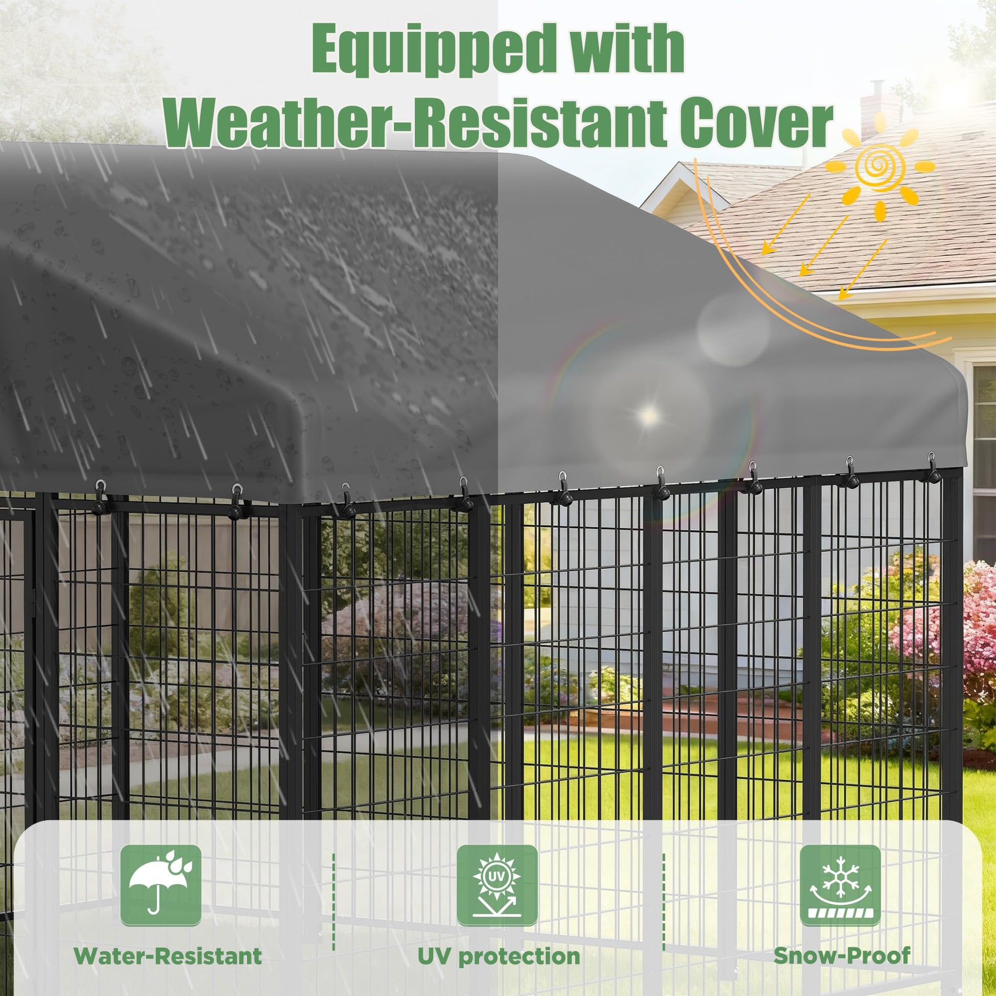 Heavy-duty 8x8 outdoor dog kennel with waterproof cover, secure lock, and spacious run. Durable steel enclosure for safe, weather-resistant pet housing.