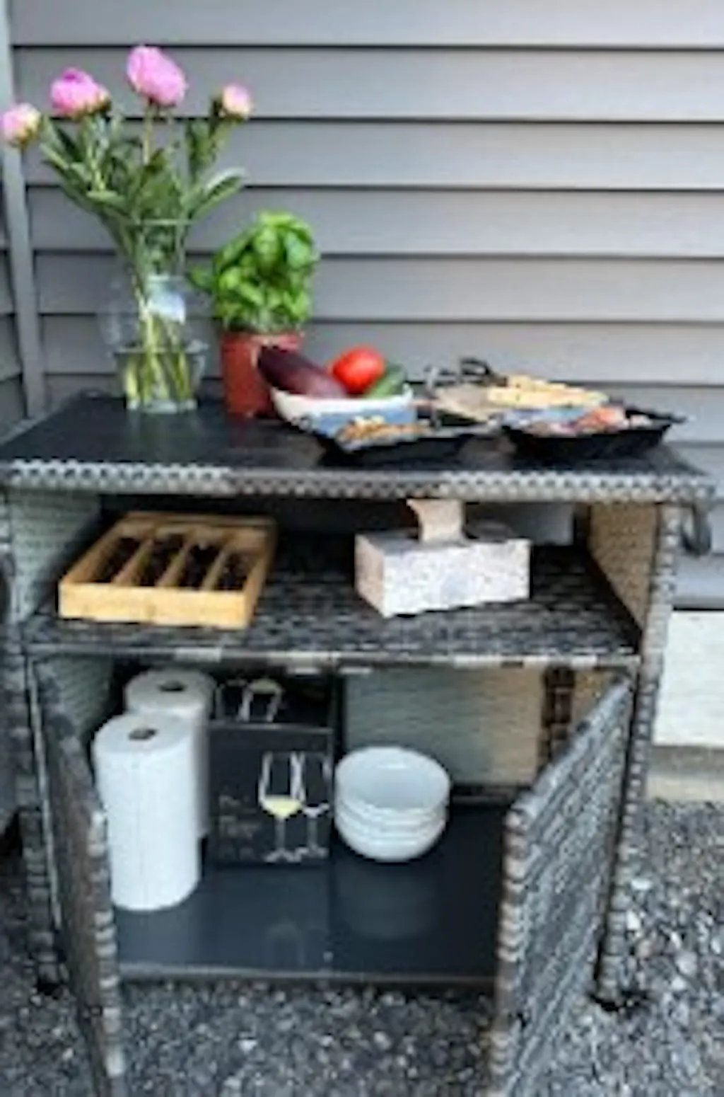 Keeps all my grilling tools and sauces within reach. The wheels make it easy to move around the patio. Cooking outside feels so much more organized now.