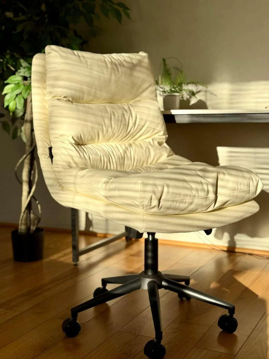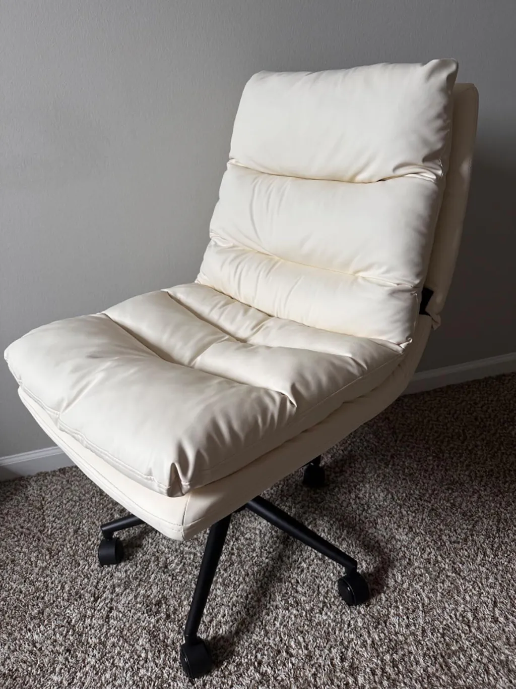 the white leather finish brightens up my home office, giving it a modern and clean look. the chair swivels smoothly, and the adjustable height feature ensures comfort during long hours at the desk. assembly was straightforward, and the chair feels sturdy and well-made.