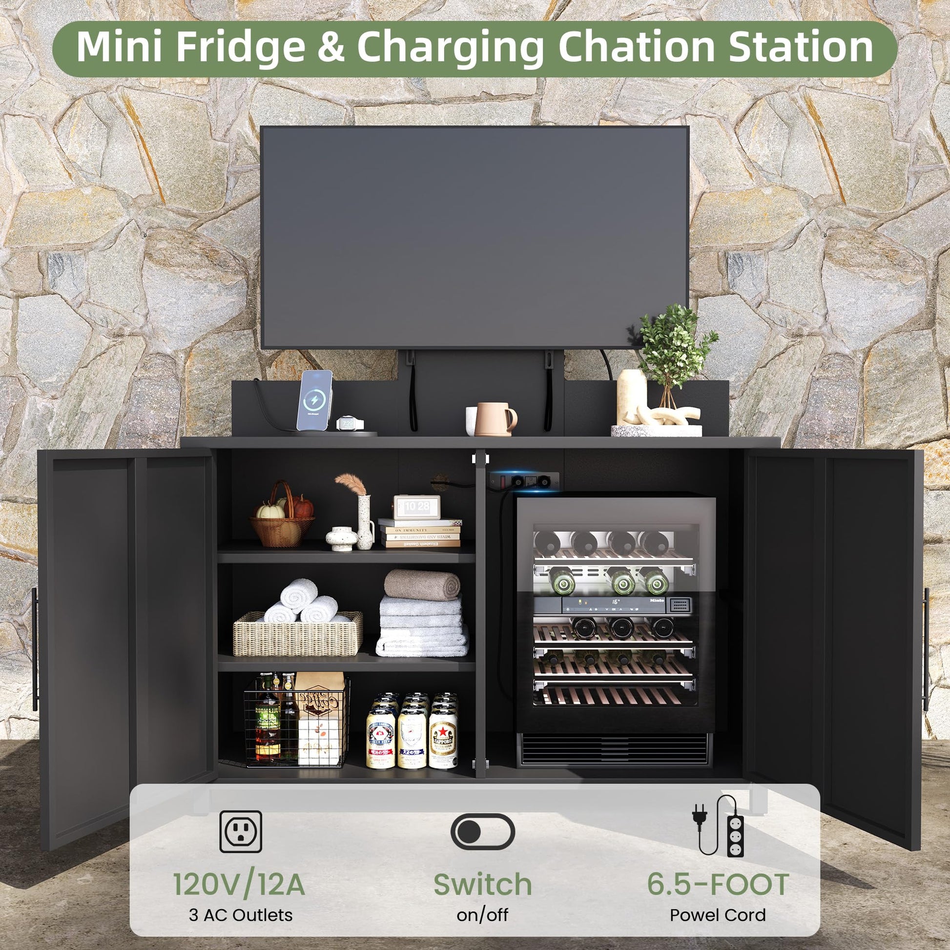 Upgrade your space with this versatile outdoor TV stand, designed for both indoor and outdoor use. Featuring a built-in power outlet and smart cable management, it keeps your setup clean and organized. Built from heavy-duty powder-coated metal, this weather-resistant TV cabinet supports TVs up to 80 inches and 250 lbs. With spacious storage, ventilated panels, and flexible compartments, this outdoor entertainment center is perfect for patios, backyards, or living spaces, combining durability, functionality, and modern style.