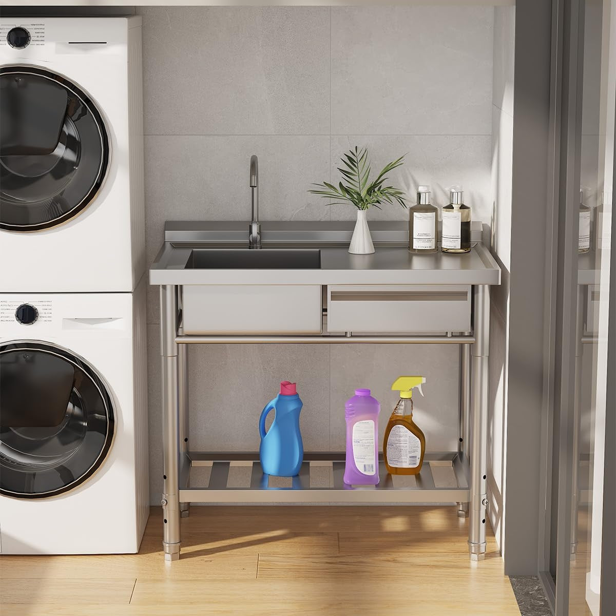 Upgrade your workspace with the YODOLLA freestanding utility sink, featuring a deep stainless steel sink, integrated workbench, storage drawer, and bottom shelf for efficient organization. Built from durable stainless steel, this commercial utility sink resists rust and corrosion for long-lasting use. The 360° swivel gooseneck faucet with hot and cold water connections ensures flexible cleaning, while the removable strainer and efficient drainage system prevent clogs. Perfect as an indoor or outdoor utility sink for garages, laundry rooms, restaurants, patios, farms, and BBQ areas.